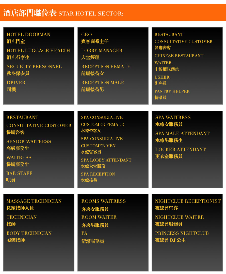 職位包含酒店大堂總臺制服、餐飲制服、酒店客房制服、水療spa制服、夜總會部門制服等。