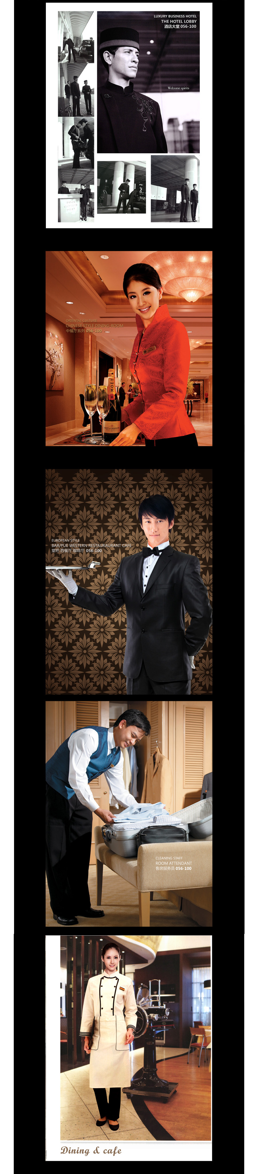 酒店制服含義,其一是指不同部門(mén)不同崗位員工服飾的可識(shí)別性。比如前廳部服飾與客房部服飾的區(qū)別,又比如同為廚師服飾,其帽子的形狀和高度,衣扣的顏色和數(shù)量,就分別代表了廚師們?cè)趶N房里的不同的身份和地位。其二是指員工服飾與客人服飾的可識(shí)別性。任何一個(gè)進(jìn)入酒店的人都可以從服飾中區(qū)分出酒店員工與進(jìn)店客人。這就要求酒店員工服飾不能太時(shí)裝化。當(dāng)然,酒店服飾也需要美,但這是一種與環(huán)境融合,為酒店總體形象增添光彩的美,而不是突兀的、引人注目的、獨(dú)立的美,絕不可讓客人覺(jué)得你的光彩蓋過(guò)了他(她)。其三,管理人員和服務(wù)人員的服飾要有明顯區(qū)別。如領(lǐng)班結(jié)領(lǐng)結(jié),主管穿斑馬褲(裙),部門(mén)經(jīng)理著深色西裝等。酒店服飾一般分類(lèi)很多中,管理人員與服務(wù)員服裝一般也不一樣的。一室九部 總經(jīng)理與副總經(jīng)理、客務(wù)部、 房務(wù)部、餐務(wù)部、商品部、工程部 、保安部、人事部、財(cái)務(wù)部、康樂(lè)部。每個(gè)部門(mén)與每個(gè)部門(mén)的服裝服飾要求也不一樣。管理與執(zhí)行者的服飾也不會(huì)相同,一般比較酒店制服比較突出層次。