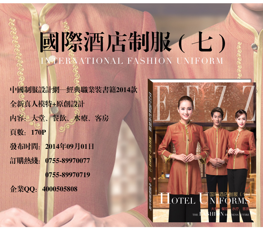 1.中式風(fēng)格,服裝款式根據(jù)傳統(tǒng)旗袍和唐裝加入時(shí)尚元素改良而成,款式大都是:立領(lǐng)、開(kāi)叉、斜襟、對(duì)襟。所選用的面料是:提花、暗提花、印花、麻、雪紡、紗等。(包含部門(mén):前廳、中餐、西餐、廚師、水療、客房)。